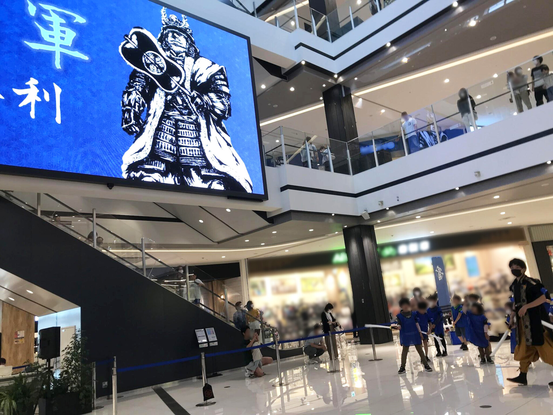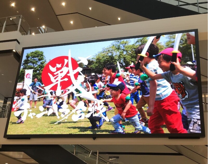 「チャンバラ合戦〜長篠の戦い〜inイオンモール豊川」では、大迫力の400インチLEDビジョンを活用し、チャンバラ合戦のプロモーションビデオを流したり、勝敗と連動して「青軍勝利(赤軍勝利)」と液晶に映し出したりしました。