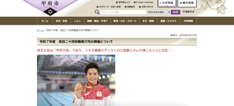 「武田二十四将騎馬行列」は、山梨県甲府市で開催されている行事です。武田信玄の命日である4月12日に、武田神社の例大祭と併せて行われます。信玄とその忠臣たち「武田二十四将」に扮した参加者が、甲府市内を練り歩きます。2025年の行列では、リオデジャネイロオリンピック銅メダリストであり、甲府大使をつとめる競泳選手の江原騎士さんが信玄役を演じました。