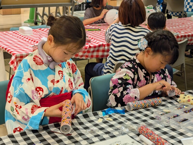 「戦国ワークショップ」では、スポンジの刀や提灯に好きな絵を描いたり、万華鏡やかんざしをつくったりします。自由な発想を楽しめる環境は、創造する力や表現力の育成につながります。
