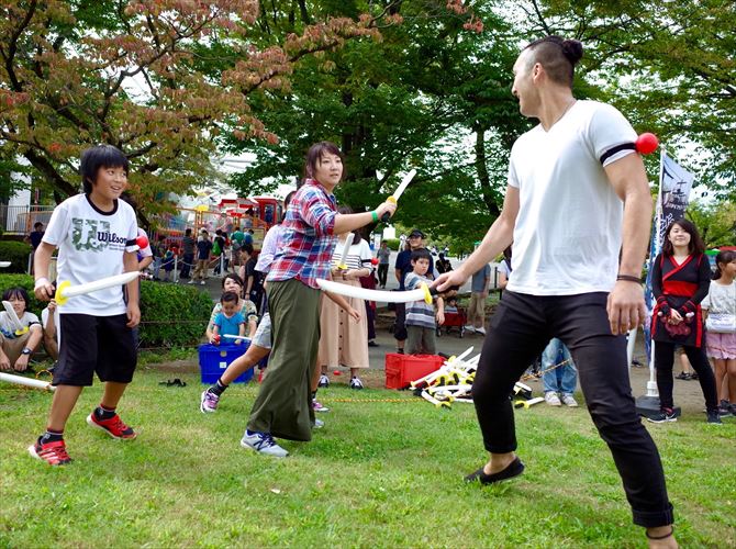 秋も本番なよみうりランドで、チャンバラ合戦を行います。