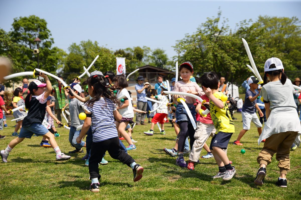 丈夫なスポンジ刀を使用します。顔や腕にあたっても痛くないので安心してください。