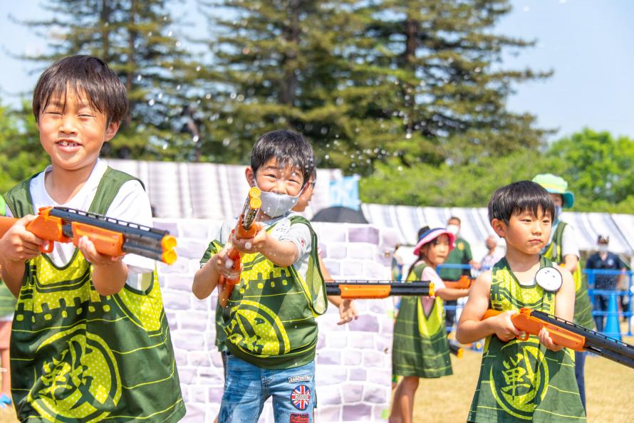 水合戦は2軍に分かれて、火縄銃型の水鉄砲を使って戦う合戦アクティビティです。