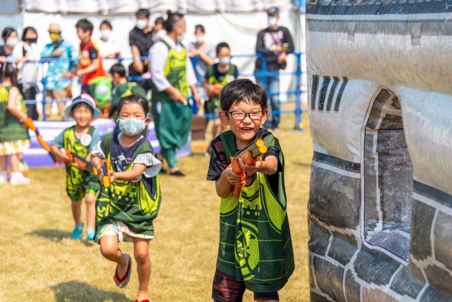 水合戦は2つの軍に分かれて、火縄銃型の水鉄砲を使って戦う合戦です。