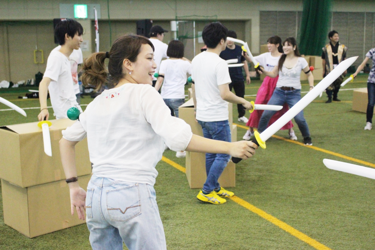 チャンバラ合戦は、スポンジ製の刀を使いて敵の腕についた「命」と呼ばれるカラーボールを落としあう、合戦型アクティビティです。