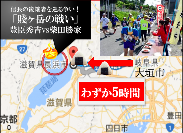 ちょうど岐阜の大垣にいた秀吉軍は、賤ヶ岳(滋賀県長浜)の戦いに参戦する為、大垣から長浜まで52kmの道のりをたった5時間で行軍しました。現代検索しても徒歩最低10時間かかる道のりです。現代の様に舗装もされていない道を5時間とは驚きです。